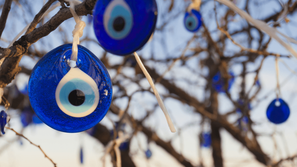 O Olho Grego, também conhecido como Nazar, é um amuleto de proteção contra o mau-olhado. Acredita-se que ele absorva ou desvie as energias negativas enviadas por pessoas com inveja ou má intenção, trazendo sorte e proteção ao seu portador.